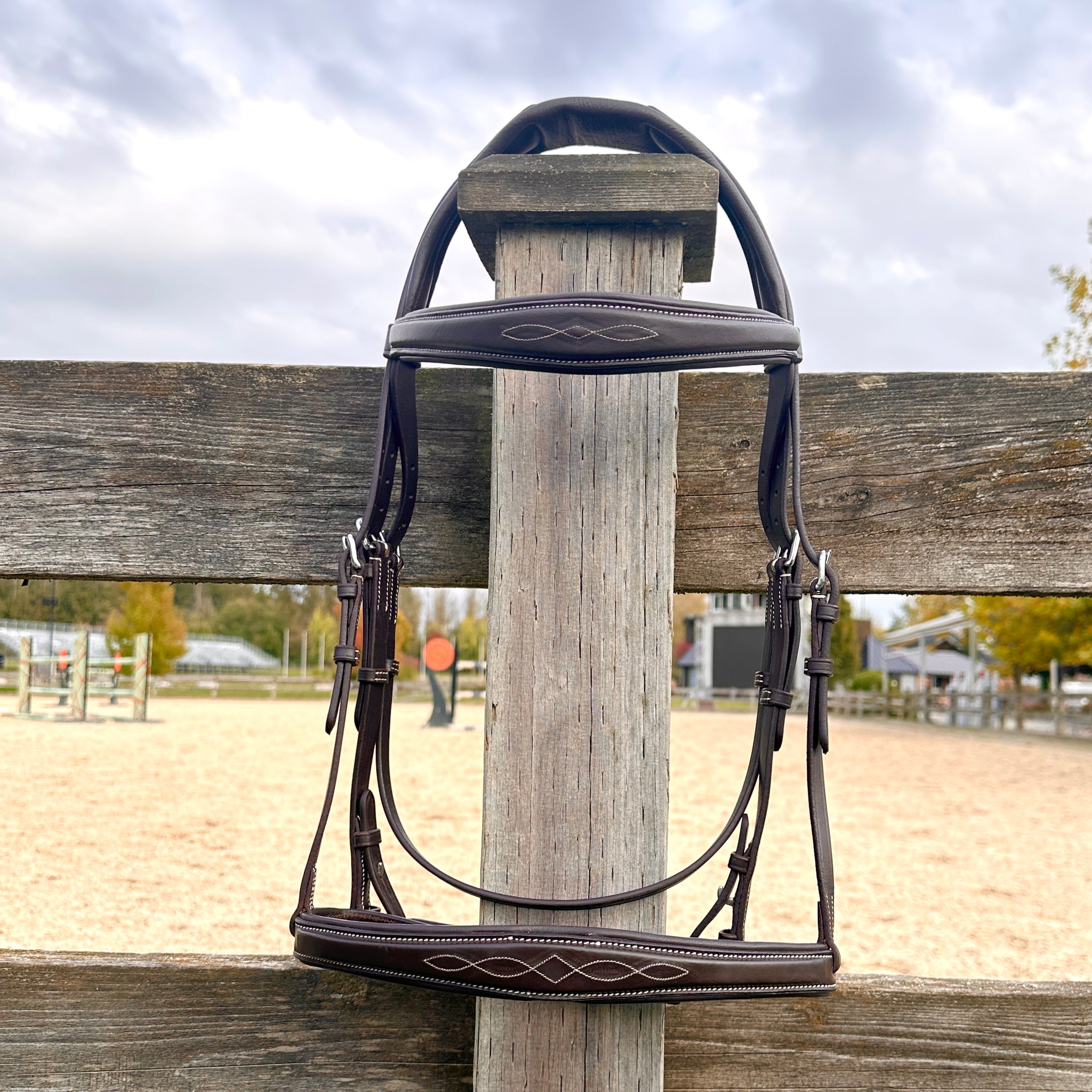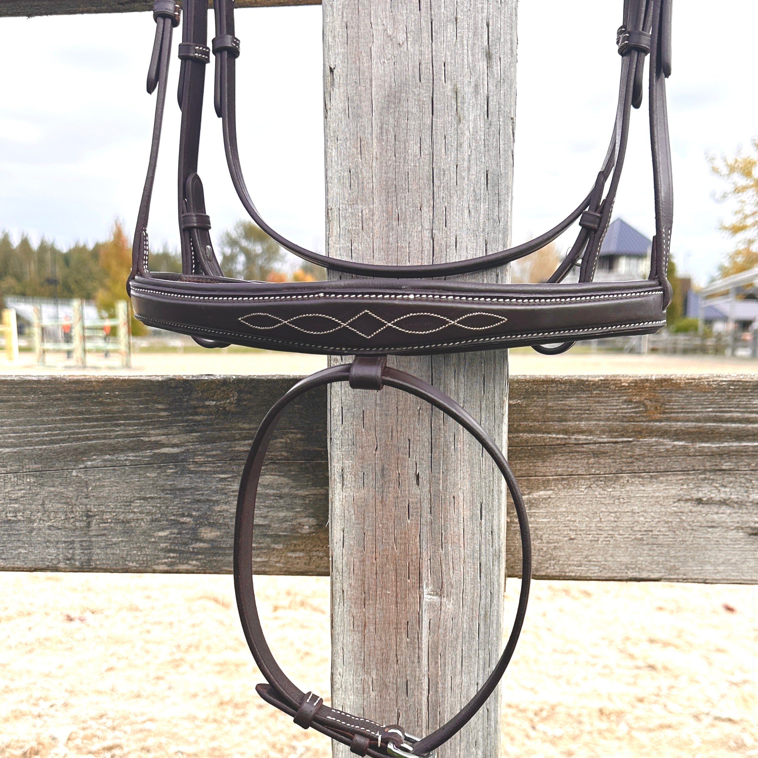 Beautiful and elegant classic styling with white stitching this bridle is always a best seller. Soft padded nose & browband. We strive for comfort and style in our bridles and this line has it all. Soft padded gently shaped monocrown that is flexible and fits! Equine tested and approved! Reins sold separately.