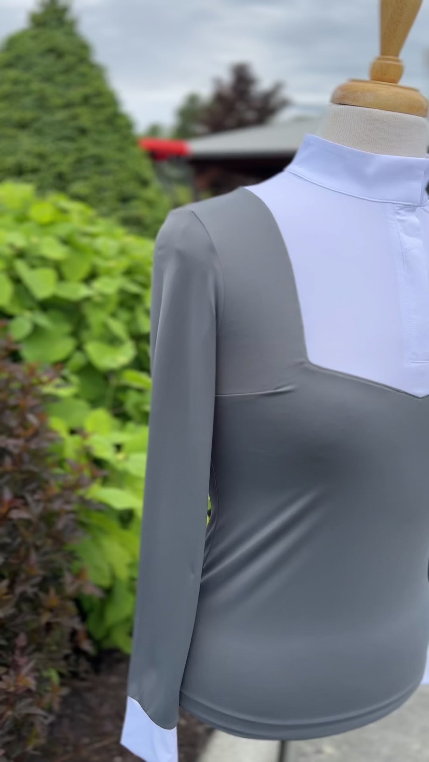 The Alma Show shirt is so soft and light. We have perfected this one for the hunter ring. Covered zip with snap collar with no logo at the collar. You don't want to miss this liquid soft fabric. Mesh panel on the back for air flow and design.